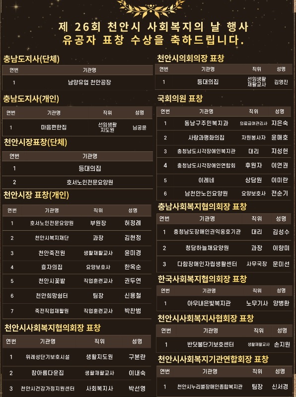 제 26회 천안시사회복지의 날 행사 유공자 표창수상 페이지 정보 작성자작성자 : 천사협 조회조회수 : 441회 작성일작성일 : 25-09-23 13:14 본문 수상을 축하 드립니다! 목록 다음글「제26회 천안시사회복지의 날 행사」사회복지 유공자 추천 협조 요청 25.07.28